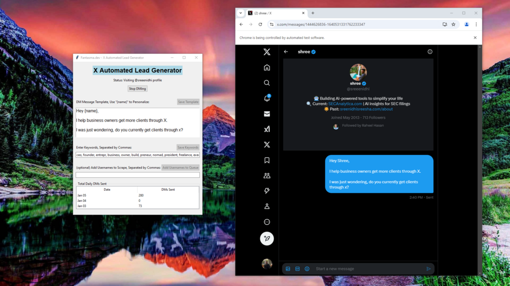 ⚠️ Warning this tool is not approved by X. It is hard to detect though and could get you banned if you send spam. Consider using an alt, I used my main though for 2 months and it's been fine.